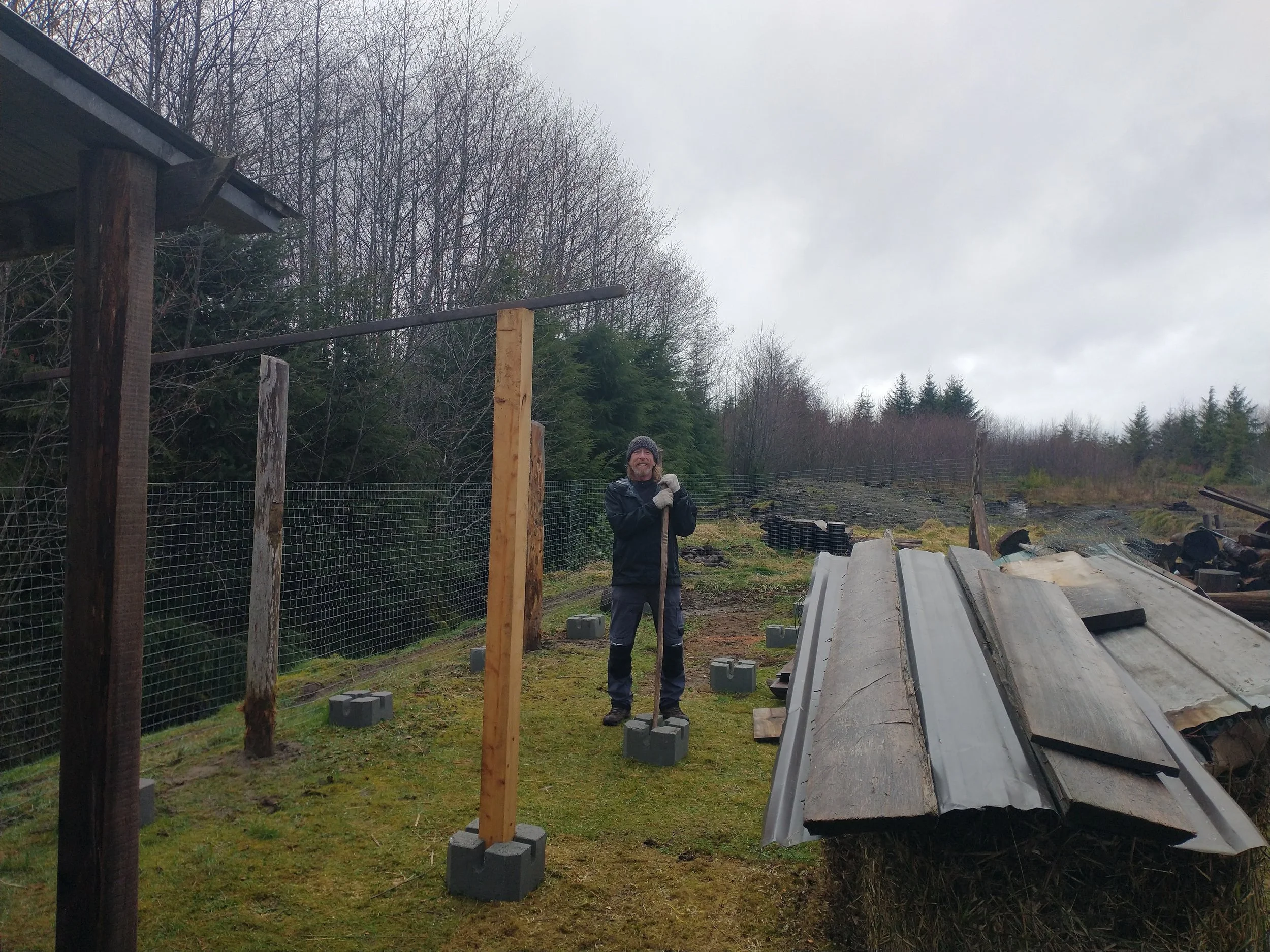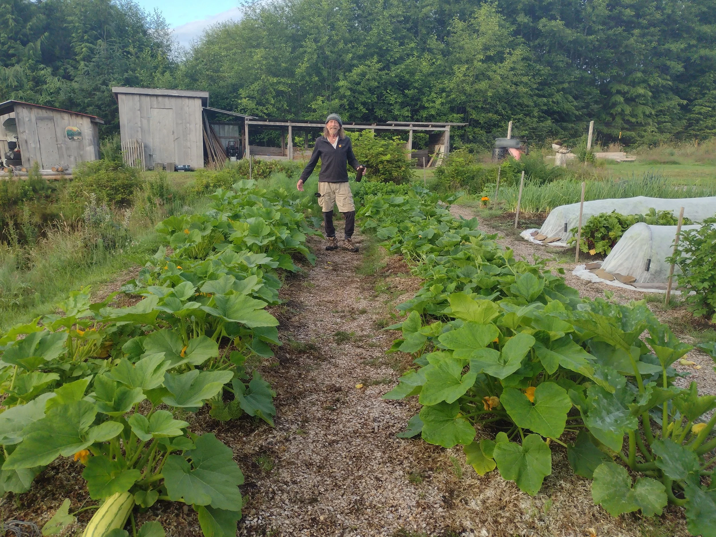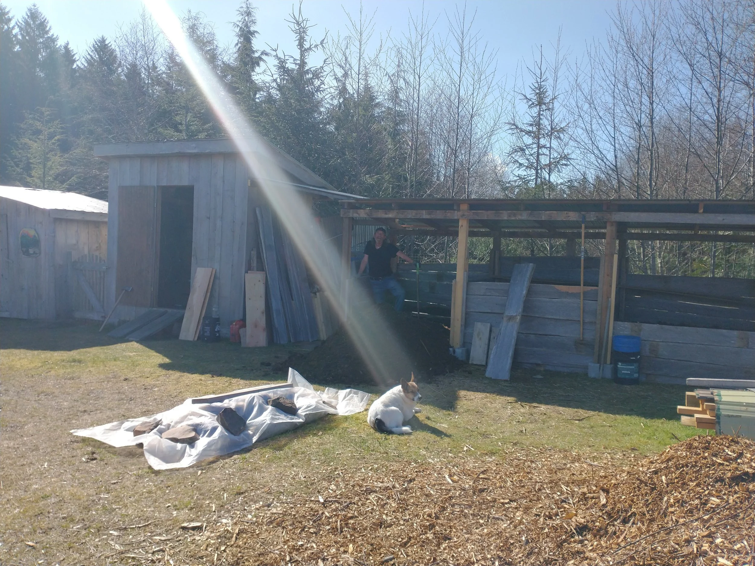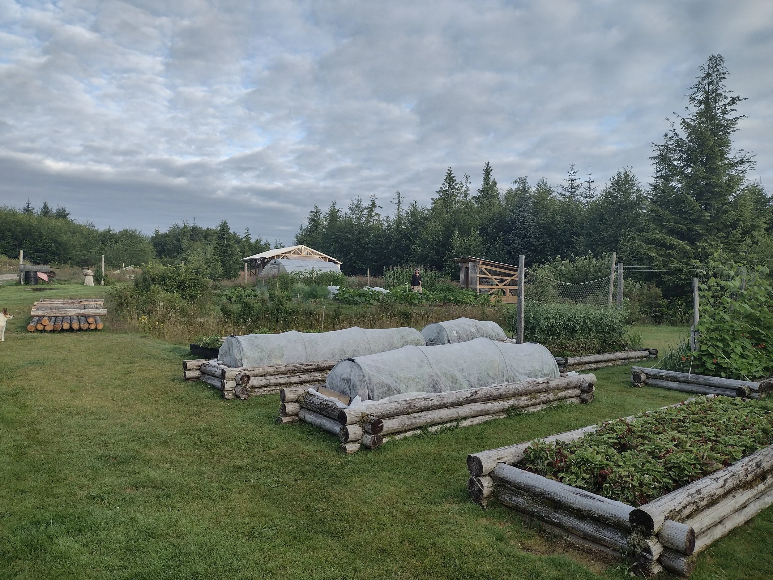 When Greg retired in 2022, he continued this pursuit in earnest, building four 5x5 compost bins (and filling them!), and a transplant shed, erecting a second greenhouse, and hiring a neighbour to build a 20x40 roofed platform for a newly purchased 20x14 wall tent for future workshops & accommodation and an eventual outdoor kitchen.